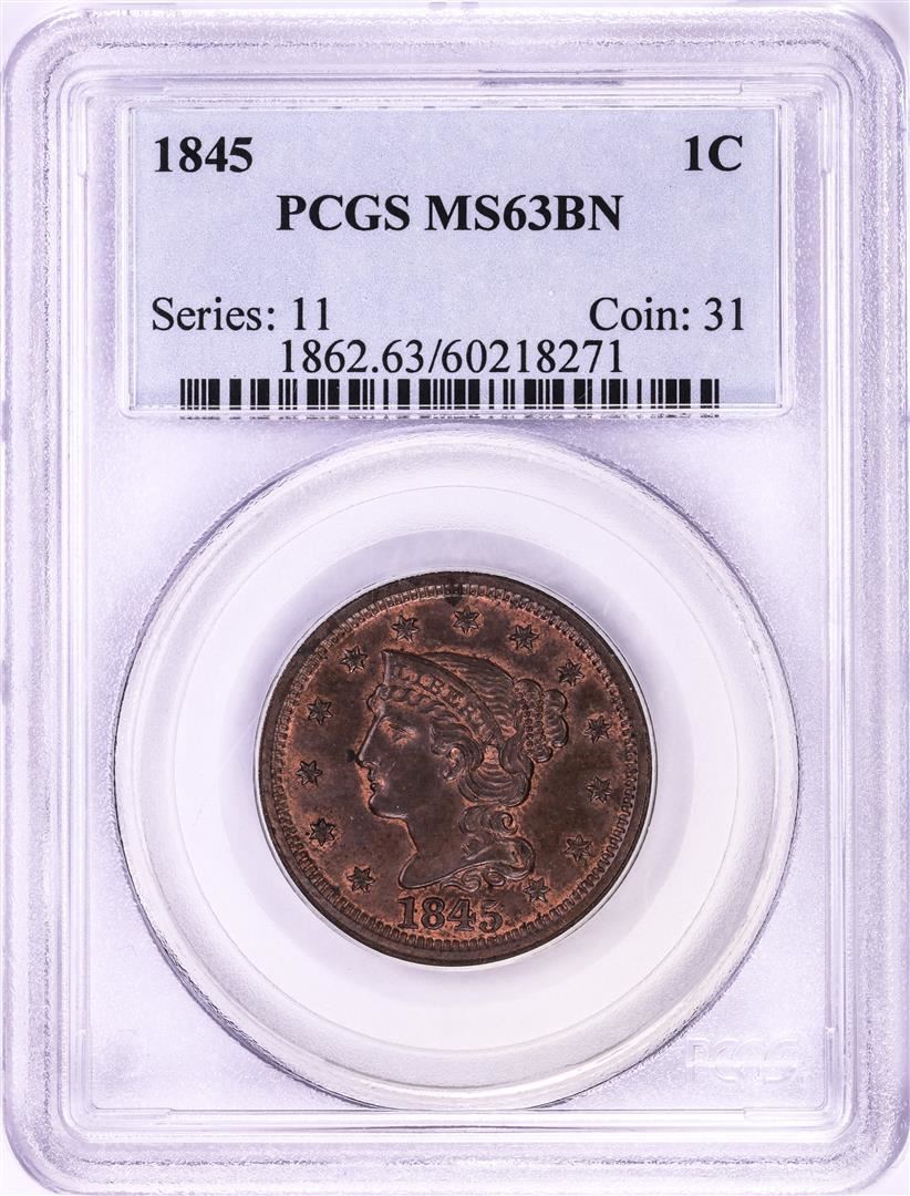 One 1845 Coronet Hair Large Cent Coin NGC MS63BN. NGC Certified.