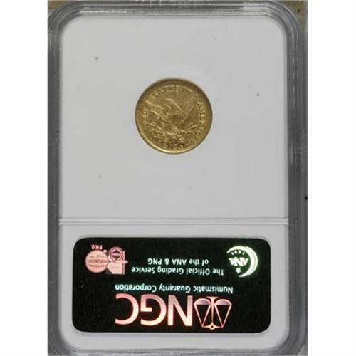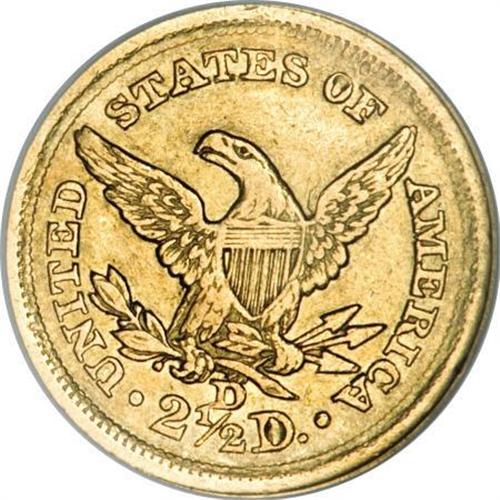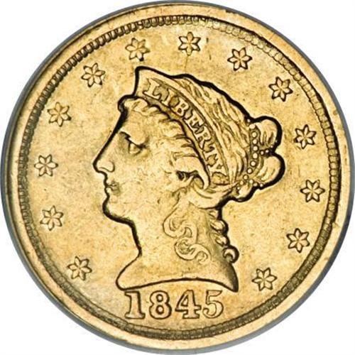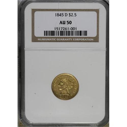 <B>1845-D $2 1/2 AU50 NGC.</B></I> Variety 6-I. This issue of 19,460 pieces experienced considerable attrition, and today, better examples prove challenging. Though the portrait and eagle show striking softness, the satiny yellow-gold surfaces retain considerable luster. Minimally marked overall, though an abrasion is noted on the cheek.<BR><BR><B>Coin Engraver:</B> Christian Gobrecht<BR><BR><b>Shipping:</b> Coins & Currency (<a target="_blank" href="http://www.heritageauctions.com/common/shipping.php">view shipping information</a>)