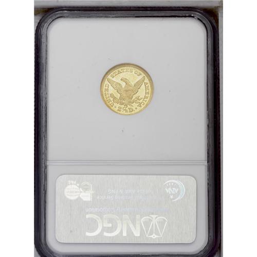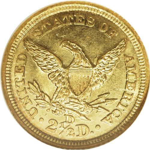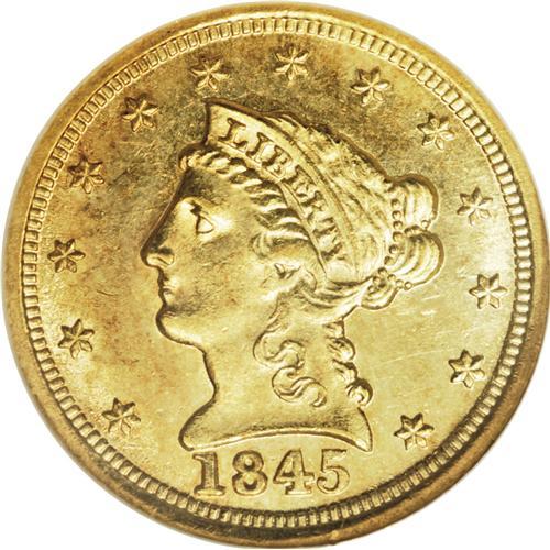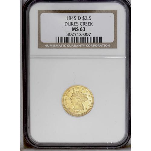 <B>1845-D<$2 1/2> MS63 NGC.</B></I> Variety 6-I. Reverse of 1844. The only variety known for this year.<BR> Production of quarter eagles remained relatively high in the middle years of this decade. Just under 20,000 1845-D quarter eagles were struck, of which around 200 pieces are known today. The 1845-D ranks 14th of 20 issues in terms of its overall rarity, but it jumps to the 11th spot in high grades. There are around three dozen known in AU, but the 1845-D is extremely rare in properly graded Uncirculated. In fact, we are aware of only three Uncirculated pieces: the Duke's Creek coin, the Green Pond: 1021 coin (graded MS62 by PCGS when it was last sold by Heritage in the January 2004 FUN auction), and the Chestatee: 7643 coin (graded MS62 by PCGS) that is now owned by a Kansas specialist.<BR> This beautiful piece is characterized by soft yellow-gold color atop clean, lustrous surfaces. It shows a typical strike for the date, with some weakness at the centers; the borders are fully detailed. The surfaces show no marks of significance.<BR> When last offered in the Bass sale in October 1999, this piece set an all-time auction record for the date, bringing $26,450. It will be interesting to see what it realizes today.<BR><I>Ex: 1975 ANA Sale (Superior, 8/75), lot 376; Harry Bass Collection (Bowers and Merena, 10/99), lot 376; Hancock and Harwell.</B></I><BR><I>From The Duke's Creek Collection of Dahlonega Gold.</B></I>