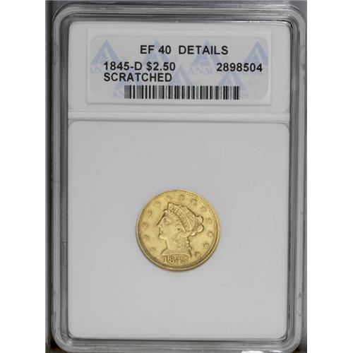 <B>1845-D<$2 1/2>--Scratched--ANACS. XF40 Details.</B></I> Variety 6-I. Light to moderate wear is well-distributed over the softly struck yellow-orange surfaces. Multiple scratches of varying severity crisscross the obverse.