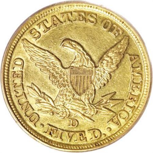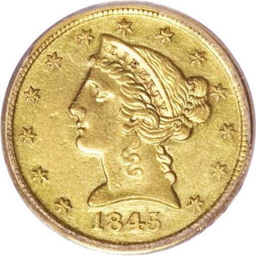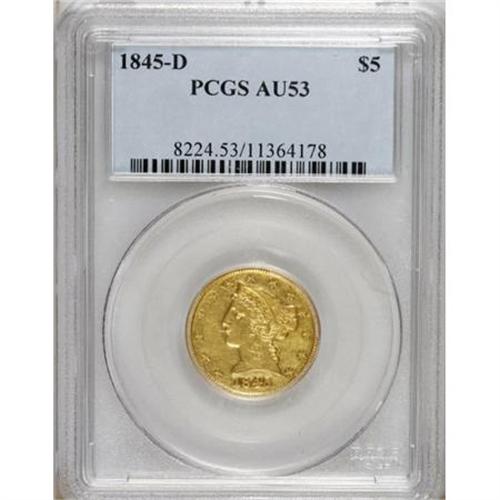 <B>1845-D $5 AU53 PCGS.</B></I> Variety 12-I. Winter (2003) notes that the 1845-D is one of the most available Dahlonega half eagle issues, though the collector may have difficulty finding a visually appealing example. For one fortunate bidder, no further searching will be necessary. This piece displays a solid strike, including on the often-weak stars, which display practically full radial lines. The yellow-gold surfaces retain considerable luster and have glints of orange and green. Modest wear is noted on the highpoints, and both sides have wispy abrasions, most of which appear in the fields. Highly appealing overall. Population: 22 in 53, 51 finer (7/07).<BR><BR><B>Coin Engraver:</B> Christian Gobrecht<BR><BR><b>Shipping:</b> Coins & Currency (<a target="_blank" href="http://www.heritageauctions.com/common/shipping.php">view shipping information</a>\)