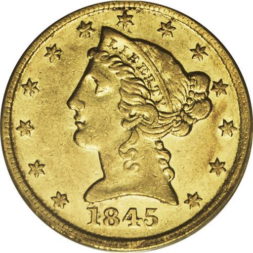 <B>1845-D $5 AU55 PCGS.</B></I> Variety 12-I. An appealing, lightly circulated example of this Dahlonega half eagle issue, a popular choice for branch mint gold type collectors. The yellow-orange surfaces have glints of frosty luster at the periphery. The usual abrasions mark the obverse, but all things considered, this is a well-preserved piece. Population: 20 in 55, 37 finer (12/06).<BR><BR><b>Shipping:</b> Coin/Currency (<a target="_blank" href="http://www.heritageauctions.com/common/shipping.php">view shipping information</a>)