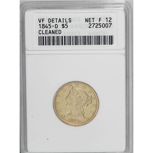 1845-D $5 --Cleaned--ANACS. VF Details, Net Fine 12. Va