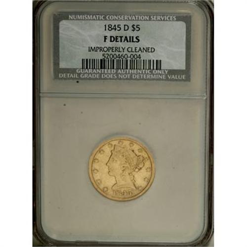 <B>1845-D $5 --Improperly Cleaned--NCS. Fine Details.</B></I> NGC Census: (0/0). PCGS Population (0/0). Mintage: 90,629. (#8224)<BR><BR><B>Coin Engraver:</B> Christian Gobrecht<BR><BR><b>Shipping:</b> Coins & Currency (<a target="_blank" href="http://www.heritageauctions.com/common/shipping.php">view shipping information</a>)