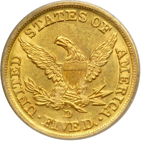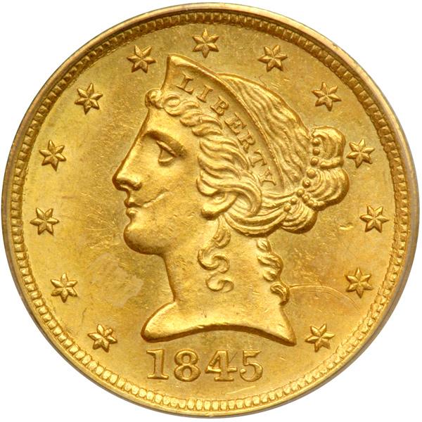 1845-D $5 Liberty. PCGS graded MS-61. Boldly struck with lovely golden toning and untouched surfaces. Pleasing and lustrous are the satiny surfaces which includes light golden to pale reddish-gold color. Much surface smoothness is seen, particularly on the obverse. There is a slight depression on the cheek (as made). A truly notable, indeed impressive example of the D-mint issue this year. Collectors have long lamented the fact that Dahlonega Mint pieces are notorious for their unavailability in Mint State, the ultimate business strike classification. We are happy to present this well struck coin for your approval.