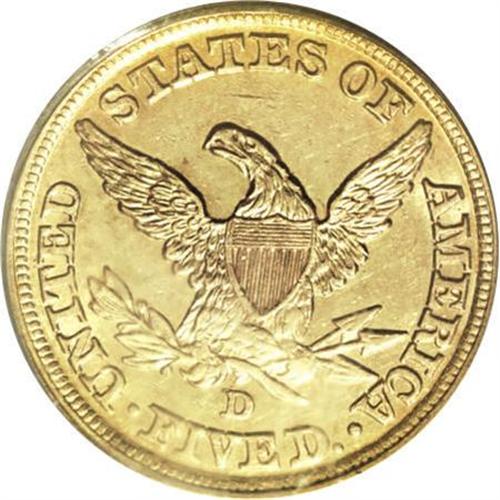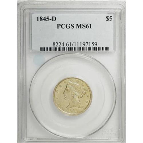 <B>1845-D $5 MS61 PCGS.</B></I> Variety 12-I. An especially pleasing Mint State example with lovely green-gold surfaces and satin luster. Both sides of this piece are quite well struck without weakness on either side. Only the hair curls below the coronet, and the eagle's right (facing) claw prevent a "full strike" comment. The obverse has light clash marks and the reverse has fine die cracks. Population: 6 in 61, 6 finer (12/07).<BR><BR><B>Coin Engraver:</B> Christian Gobrecht<BR><BR><b>Shipping:</b> Coins & Currency (<a target="_blank" href="http://www.heritageauctions.com/common/shipping.php">view shipping information</a>)