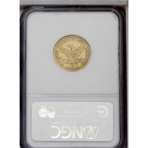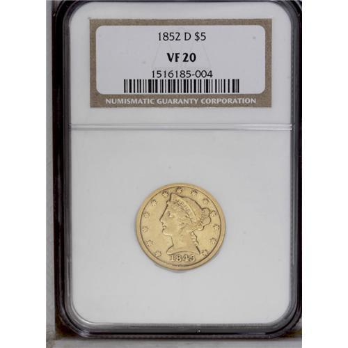 <B>1845-D<$5> VF20 NGC.</B></I> Variety 13-I, the scarcer of the two known die pairs, with the 1 in the date close to the bust. Attractive yellow-gold coloration bathes each side, and the design elements retain nice detail for the grade. A few minute marks are scattered over each side.
