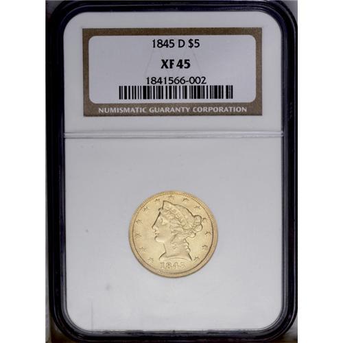 <B>1845-D $5 XF45 NGC.</B></I> Variety 12-I. This is the more common of two varieties, created from two different obverse dies and a single reverse die. This example has the date separated from the bust, while the other and rarer variety has the digit 1 joined to the bust. Pleasing light yellow-gold surfaces with only a few tiny blemishes or imperfections.