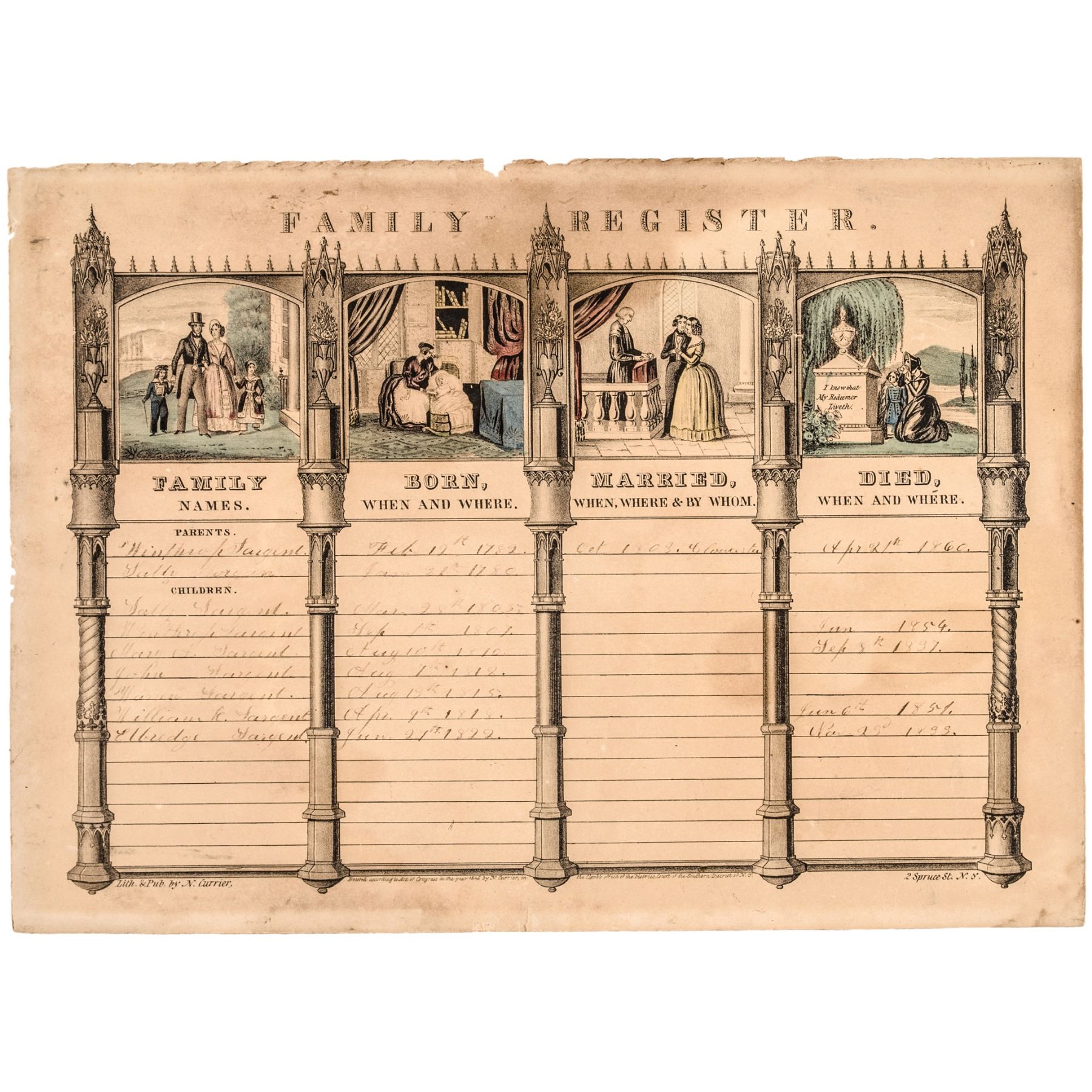 1845 Nathaniel Currier “FAMILY REGISTER.” Lithograph The Historic Sargent Family of Gloucester, Massachusetts