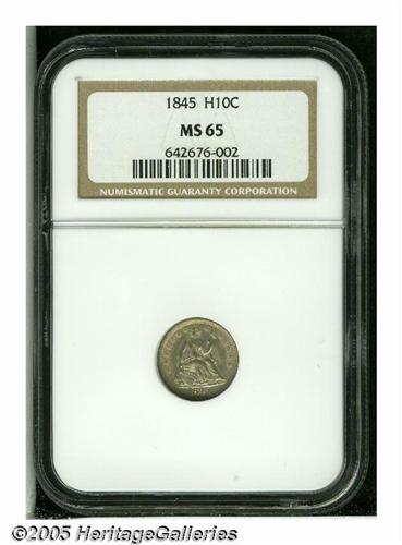 <B>1845<H10C> MS65 NGC.</B></I> Lustrous surfaces are visited by wisps of light tan patina, and the design features are well impressed. A moderate linear abrasion is observed on the thigh of Liberty's right leg, and a couple of minute marks occur on Liberty's neck and right arm. Population: 24 in 65, 5 finer (4/05).