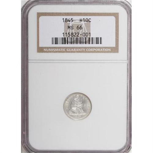 <B>1845 H10C MS66 NGC.</B></I> Sharply struck with exemplary eye appeal for this desirable half dime issue. Soft, pleasing luster enlivens the predominantly silver-white surfaces, as does a touch of gold at the lower obverse. Census: 3 in 66, 2 finer (10/07).<BR><BR><B>Coin Engraver:</B> Christian Gobrecht<BR><BR><b>Shipping:</b> Coins & Currency (<a target="_blank" href="http://www.heritageauctions.com/common/shipping.php">view shipping information</a>)