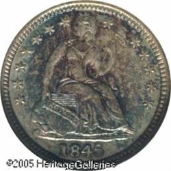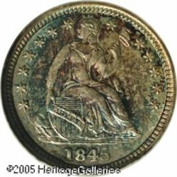 <B>1845 H10C MS67 NGC.</B></I> This is equal to the finest certified examples of this date. The strike is quite sharp, perhaps full, with complete lines in the obverse stars, strong hair definition, and full details on nearly every leaf. The fields are reflective, especially on the obverse, with satiny luster throughout. Each side has delightfully intermingled toning. The obverse is mostly blue and lilac with some amber and green highlights. The reverse is similar with less lilac color. This is one of the common issues from this decade, and actually has the highest overall population of any date in the 1840s. At the same time, this population is only a small portion of the Philadelphia Mint issues from the late 1850s. This offering represents an important opportunity to acquire a Superb Gem quality example of a scarce date at only a modest premium above the common issues. Population: 2 in 67, 0 finer (1/05). Lot:6123
