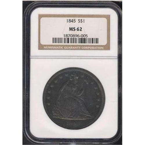 <b>1845 Liberty Seated Dollar. NGC graded MS62.</b> A hard to top array of dark gray "antique" hues layer the surface of this Mint State rarity from the year 1845, one of the lowest mintage seated Liberty dollars in the No Motto period from 1840 to 1865. Not for everyone because of its dark color, all the same, it is a prize for someone who wants a presentable example of this elusive coin in Mint condition. A mere 24,500 pieces struck.