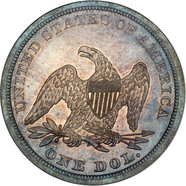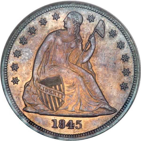 1845 Liberty Seated Dollar. PCGS graded Proof 65. In a new secure plus holder. Sleek original toning on both sides. This is a deeply mirrored example with warm gold to gunmetal-blue color on both sides. The mirrored surface in the fields overlays the devices with a smart display of reflectivity in the vertical shield stripes on the reverse. To say the least, this is an extraordinary Gem quality example, and one of the finest known of the elusive 1845 Proof Seated Dollars certified by PCGS! Examination with a loupe will note a clear avoidance of marks and spotting in the delicate mirror field, which is decidedly rare to find. Handling on any early Seated Liberty No Motto Proof dollar tends to occur regularly. Liberty is well frosted by the dies, and shows up with excellent contrast for an early Proof issue.