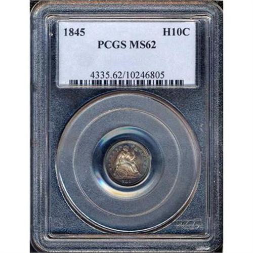 <b>1845 Liberty Seated Half Dime. PCGS graded MS62.</b> A lustrous, attractively toned specimen whose central area is white, in fact, "spotlight" fresh as the saying goes for toning like this. Well struck, also <b>(PCGS # 4335)</b> <i>