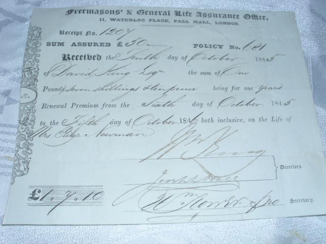 1845 Life Insurance Policy from Freemasons & General London for 50 Pounds