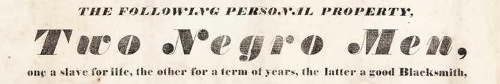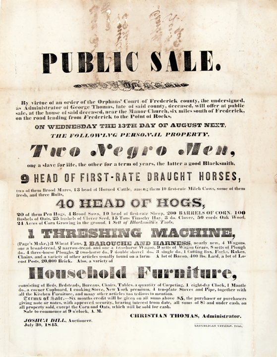 This very large, original and authentic Slave Broadside measures 18" x 23" and advertises a “PUBLIC SALE” in Frederick, Maryland on August 13, 1845. The highlight, listed as the first major item, “THE FOLLOWING PERSONAL PROPERTY,” of the sale was: “TWO NEGRO MEN, one a slave for life, the other for a term of years, the latter a good blacksmith."