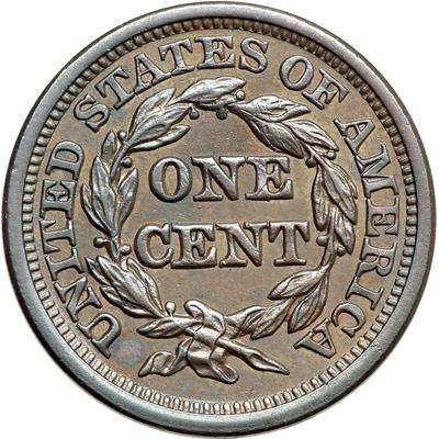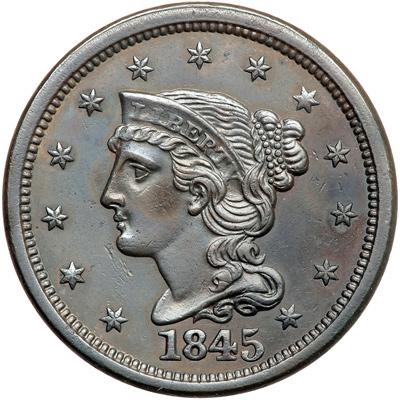 1845 N-1 R4. EF-40. Five points sharper but the obverse was lightly cleaned and retoned frosty dark steel and olive brown. The reverse is a more natural and attractive frosty chocolate and steel with lighter brown in protected areas. There are a few small nicks off the chin and a few microscopic planchet flakes on the chin and lips. MDS, die state b. The tiny die lines from the dentils under star 1 are gone.