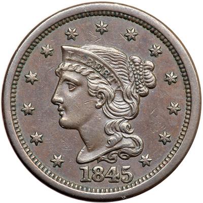 1845 N-1 R4. VF-35 Plus. Sharper but there are a few light contact marks on the obverse, including a fine pinscratch from star 7 into the hair over the T in LIBERTY. Attractive chocolate and steel brown. LDS, die state b. The fields are hard and slightly reflective. Close to EF40 in spite of the minor marks. Removed from an ANACS slab graded EF45 (ANACS label included).
