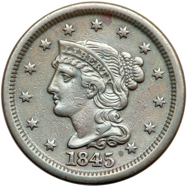 1845 N-10 R3- VF25+. Sharpness VF30 with a few too many tiny contact marks for the higher grade, including a small nick in the hair over the B in LIBERTY and a spot of reddish brown toning at the dentils just right of star 7. Both sides are covered with very fine hairlines, probably from an improper brushing rather than an old cleaning. Glossy light olive brown and chocolate. LDS, die state c, with a small raised internal cud break between die cracks on the left top of the E in UNITED. Removed from an NCS slab graded AU details improperly cleaned (NCS label included, and it shows the attribution and Reiver provenance). DWH #2969.