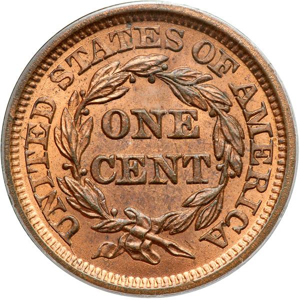 1845 N-10 R3. PCGS graded MS-64 Red & Brown. Lustrous bright original mint red fading to light steel brown on the highpoints, two-thirds of the red remaining. Great eye appeal with only a few minor defects, all mint-made. These include a tiny planchet flake on the front end of the eyebrow and another at the dentils over the right top of the second T in STATES, plus some weakness on the 18 in the date and star 13 thanks to minor die clogs in those places. M-LDS, die state b late. The small area enclosed by two die cracks over the left top of the E in UNITED has become a slightly raised triangular cud. In addition, the dentils on the obverse flow over the rim. Our grade is consistent with the slab grade. Tied for CC#1 honors. Pop 15; 3 finer in 65RB.