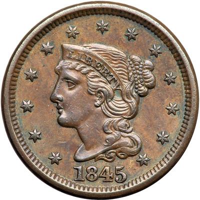 1845 N-13 R2. EF-45. Glossy light chocolate and medium brown with frosty overtones of light bluish steel on the reverse. Great eye appeal, only very light wear on the highpoints. MDS, die state a, before any rim cud breaks.