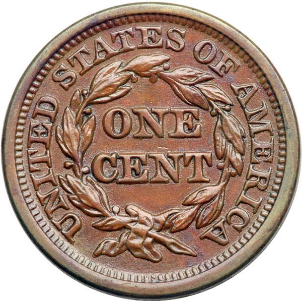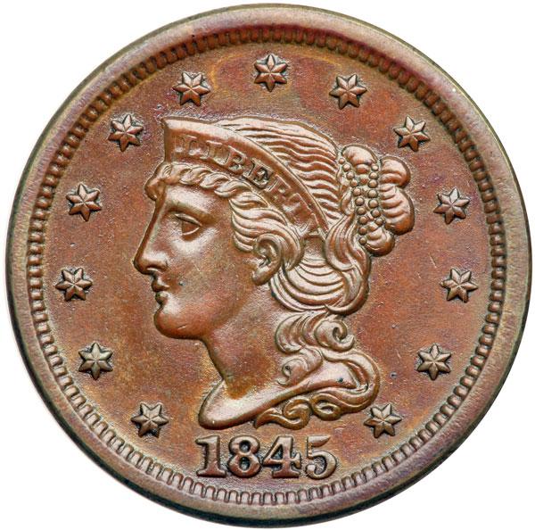1845 N-15 R4 AU55. Close to mint state but covered with a very thin layer of lacquer that imparts a high gloss to the surfaces. Glossy reddish medium brown. No marks or other distractions, the eye appeal excellent for the grade. MDS, die state b. The die lines over star 13 are gone and a fine die crack passes through the tops of UNITED. The fields are very slightly rough from microscopic die flowlines. Tied for CC#4 in the Grellman census. Comes with a nice provenance. DWH #2042.