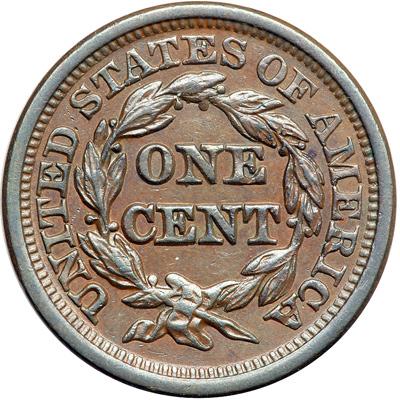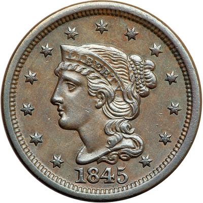 1845 N-15 R4. AU-50. Very attractive glossy light chocolate and olive brown. Smooth and nearly flawless. A pair of microscopic pinpricks over star 12 and a trail of barely visible ticks at D-S are the only marks. M-LDS, die state b. The horizontal die lines from the curl over star 13 are gone. Tied for CC#7 of this tough die variety.