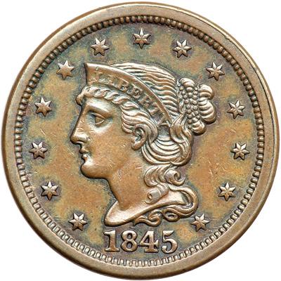 1845 N-3 R4. EF-45. Slightly sharper but lightly cleaned and nicely retoned glossy medium brown and chocolate with olive brown toning in protected areas. A few dull contact marks in the field left of star 11; otherwise mark free. Sharply struck EDS, die state a. Tied for CC#8.