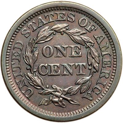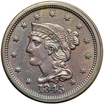 1845 N-3 R4. EF-45. Sharpness close to mint state but there is a rather large low spot (caused by debris on the die) covering the mouth and jaw with a similar low spot on the bust tip. Lightly cleaned and nicely retoned glossy chocolate and light olive brown. E-MDS, die state b, with a fine die crack through the top of UNIT. The fields are hard and slightly reflective. Tied for CC#8 in spite of the low spots.