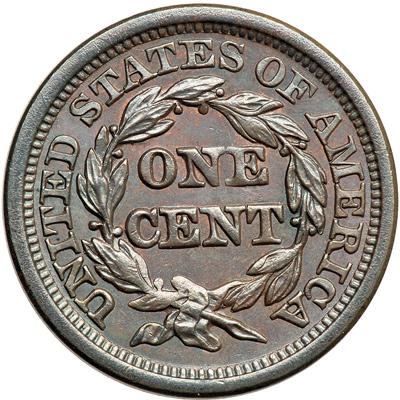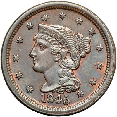 1845 N-4 R1. MS-60. Repunched 5. Frosty bluish steel and olive brown with generous traces of mint color remaining, mostly on the obverse. Nearly flawless, a tiny tick over star 3 and small planchet flakes on the rim at stars 8 & 11 are the only marks. This cent is close to choice except for minor strike weakness between the top of the ear and the Y in LIBERTY. MDS, die state c, with fine die cracks on the reverse. The repunching at the top of the 5 remains clear.
