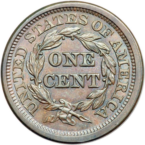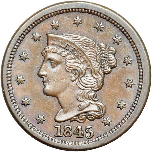 1845 N-9 R2 AU58. Very attractive frosty light chocolate and steel. Satiny mint luster covers the protected areas on both sides and this piece offers outstanding eye appeal for the grade. Just a hint of rub on the highest points from mint state. The only mark is a thin horizontal nick right of the mouth. Sharply struck EDS, die state a. The fields are hard and slightly reflective on both sides.