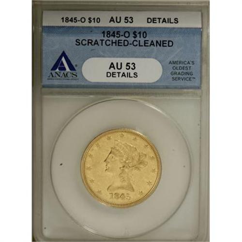 <B>1845-O $10 --Scratched, Cleaned--ANACS. AU53 Details.</B></I> The repunched date variety with obvious remnants of the prior date beneath the 8 and the left corner of the 4. A thin vertical scratch is present between the branch and the left (facing) wing, and the surfaces are a bit bright from a mild cleaning.<BR><BR><B>Coin Engraver:</B> Christian Gobrecht<BR><BR><b>Shipping:</b> Coins & Currency (<a target="_blank" href="http://www.heritageauctions.com/common/shipping.php">view shipping information</a>)