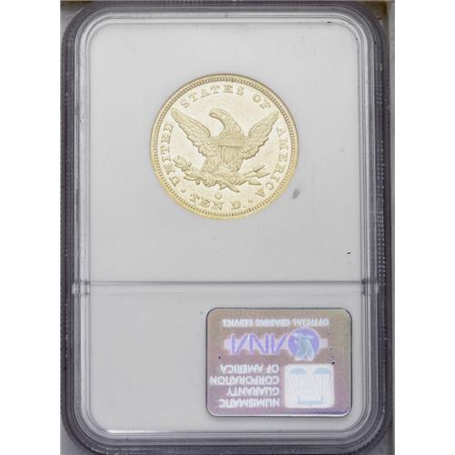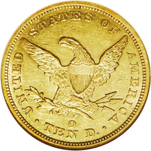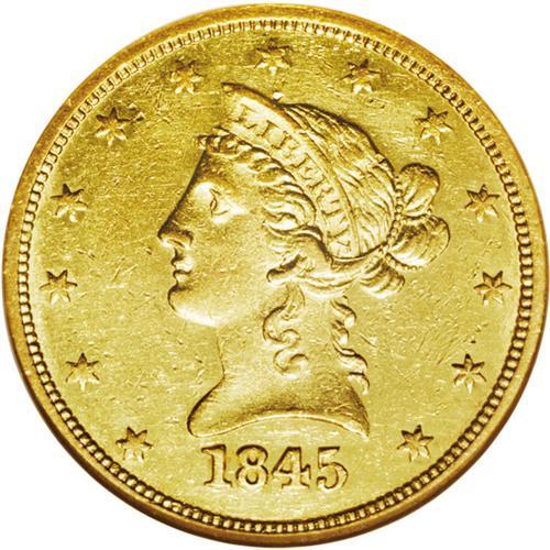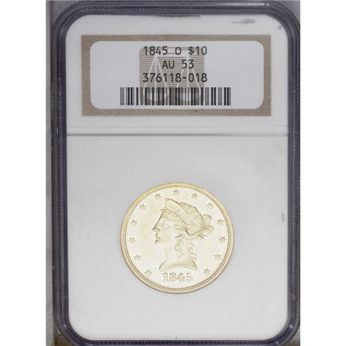 <B>1845-O<$10> AU53 NGC.</B></I> This crisply struck and bright example is only moderately abraded. Semi-prooflike luster glows from selected areas. A low mintage of 47,500 pieces makes this O-mint issue a better date within the No Motto series. NGC and PCGS combined have certified just seven pieces in Mint State. A circular piece of the second vertical shield stripe is missing, as made, reminiscent of the 'compass point' reverses seen on Seated quarters of the era.