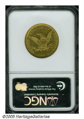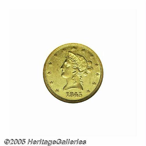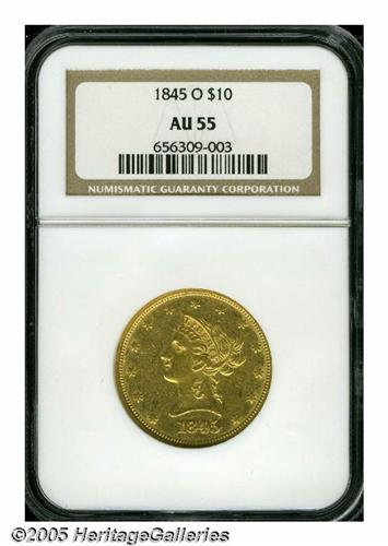 <B>1845-O<$10> AU55 NGC.</B></I> A crisply struck example of this better date New Orleans No Motto Eagle, one of only 47,500 pieces struck and the lowest O-mint production of the denomination between 1843 and 1847. Noticeable luster outlines the stars, legends, and device recesses. Distributed moderate marks are typical for the grade. The date is repunched northwest, most obviously on the 4. Population: 25 in 55, 19 finer (6/05).
