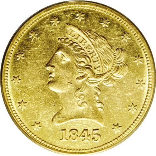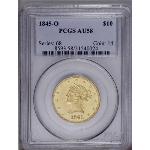 <B>1845-O $10 AU58 PCGS.</B></I> A crisply struck example of this better date New Orleans No Motto Eagle, one of only 47,500 pieces struck and the lowest O-mint production of the denomination between 1843 and 1847. Noticeable luster outlines the stars, legends, and device recesses. Distributed moderate marks are typical for the grade.