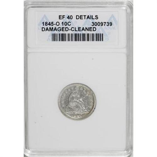 <B>1845-O 10C --Cleaned, Damaged--ANACS. XF40 Details.</B></I> NGC Census: (3/12). PCGS Population (5/9). Mintage: 230,000. Numismedia Wsl. Price for NGC/PCGS coin in XF40: $700. (#4587)<BR><BR><B>Coin Engraver:</B> Christian Gobrecht<BR><BR><b>Shipping:</b> Coins & Currency (<a target="_blank" href="http://www.heritageauctions.com/common/shipping.php">view shipping information</a>)