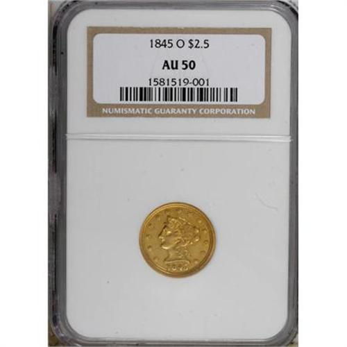 <B>1845-O $2 1/2 AU50 NGC.</B></I> Golden-brown luster outlines protected elements of this surprisingly unabraded rare date quarter eagle. The eagle's body is typically brought up. The 1 in the date is boldly repunched. A scant 4,000 pieces were struck. Census: 11 in 50, 23 finer (6/07).<BR><BR><B>Coin Engraver:</B> Christian Gobrecht<BR><BR><b>Shipping:</b> Coins & Currency (<a target="_blank" href="http://www.heritageauctions.com/common/shipping.php">view shipping information</a>\)