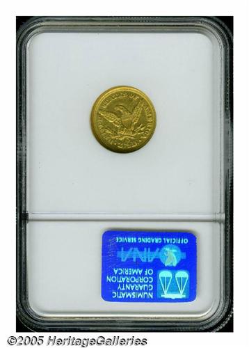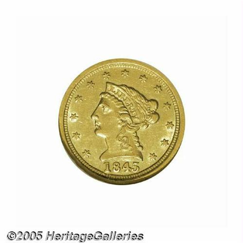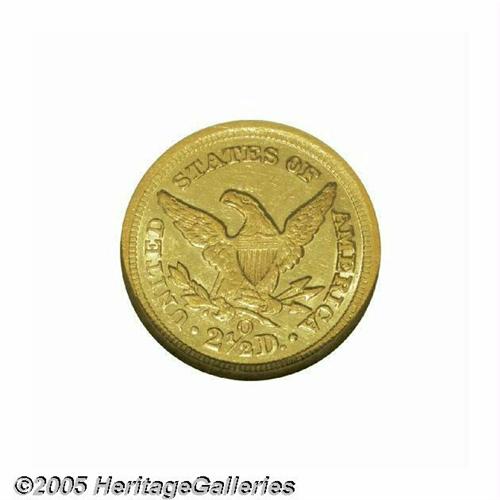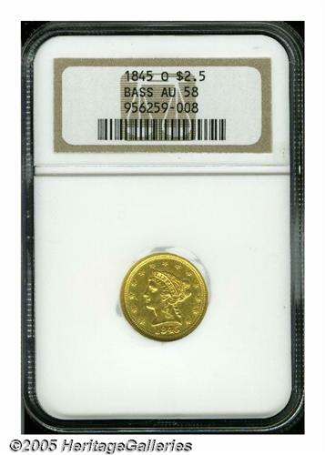 <B>1845-O<$2 1/2> AU58 NGC.</B></I> Ex: Bass. The original mintage for this issue amounted to just 4,000 coins, all of which were delivered on January 22, 1846. It has long been touted, and correctly so, as the rarest O-mint Quarter Eagle in terms of both total number of coins and high grade coins extant. This bright yellow-gold example is well struck and shows only the slightest break in luster on the highpoints. A thin lamination behind the trailing curls on Liberty's neck is mentionable, but not particularly distracting. Population: 6 in 58, 3 finer (6/05).