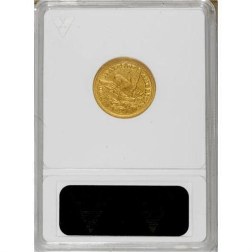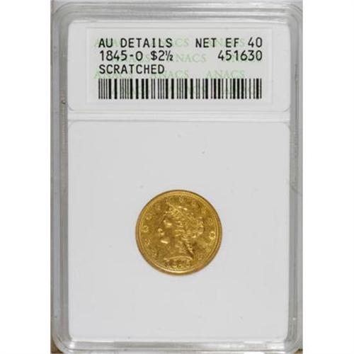 <B>1845-O $2 1/2 --Scratched--ANACS. AU Details. Net XF40.</B></I> This partly lustrous and nicely struck quarter eagle appears impressive at first glance, but a cluster of brief pinscratches is present between star 12 and the portrait. The 18 in the date is repunched. A mere 4,000 pieces were struck, and relatively few were saved.<BR><BR><b>Shipping:</b> Coins & Currency (<a target="_blank" href="http://www.heritageauctions.com/common/shipping.php">view shipping information</a>)