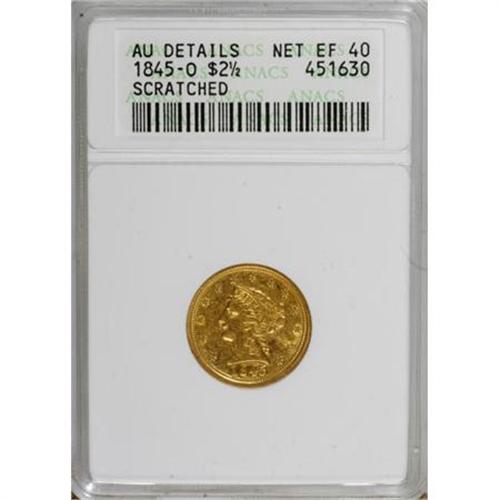 <B>1845-O $2 1/2 --Scratched--ANACS. AU Details, Net XF40.</B></I> NGC Census: (7/45). PCGS Population (6/16). Mintage: 4,000. Numismedia Wsl. Price for NGC/PCGS coin in XF40: $1,950. (#7739)<BR><BR><B>Coin Engraver:</B> Christian Gobrecht<BR><BR><b>Shipping:</b> Coins & Currency (<a target="_blank" href="http://www.heritageauctions.com/common/shipping.php">view shipping information</a>)