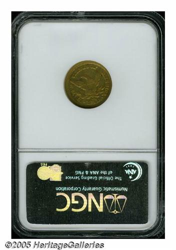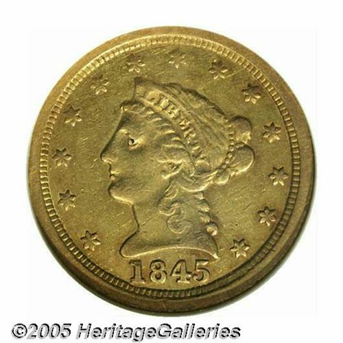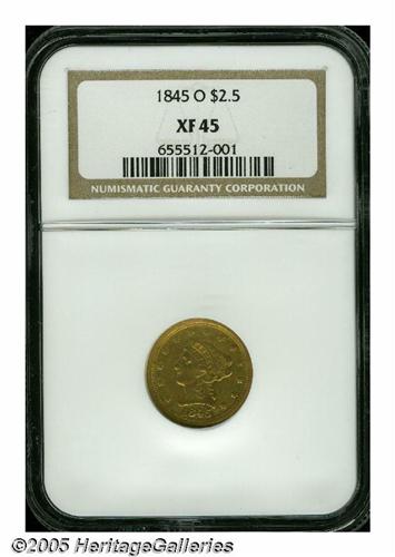 <B>1845-O<$2 1/2> XF45 NGC.</B></I> Only one variety is known, and it has a sharply repunched 18 in the date. This is an elusive, low-mintage date that will give the specialist collector a real challenge. Only 4,000 were originally coined, and today, less than 2% survive. There was no record of the mintage in the Mint Report for 1845, because there were no examples actually delivered from the New Orleans Mint during the year. The first delivery of 1846, which was dated January 22 of that year, is believed to represent the 1845 coinage. Attractive honey-gold surfaces are accented by lighter yellow color. Although moderately worn, this example has excellent surfaces. A lovely example. Population: 11 in 45, 34 finer (5/05).