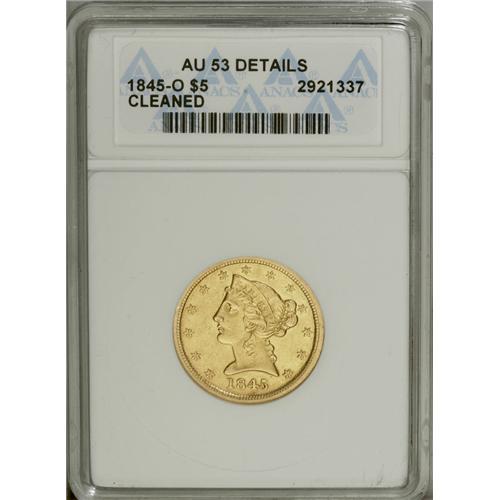 <B>1845-O $5 --Cleaned--ANACS. AU53 Details.</B></I> Of the original mintage of 41,000 pieces, only 85 to 95 survive today, according to estimates by Winter. This lightly worn example has scattered abrasions and displays strong detail, particularly at the highpoints. The yellow-gold fields are glossy.<BR><BR><b>Shipping:</b> Coin/Currency (<a target="_blank" href="http://www.heritageauctions.com/common/shipping.php">view shipping information</a>)