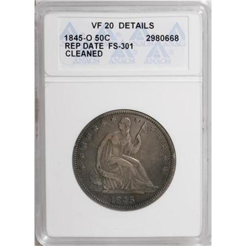 <B>1845-O 50C --Cleaned--ANACS. VF20 Details.</B></I> FS-301, formerly FS-001.5. WB-104. The date is widely repunched east, with the outer right curve of an errant 5 plainly visible. Autumn-brown and sea-green embrace the obverse, while the reverse has deep powder-blue fields. A few minor rim nicks are present, and a faint scratch on the right obverse field is subdued by a cleaning.<BR><BR><B>Coin Engraver:</B> Christian Gobrecht<BR><BR><b>Shipping:</b> Coins & Currency (<a target="_blank" href="http://www.heritageauctions.com/common/shipping.php">view shipping information</a>)