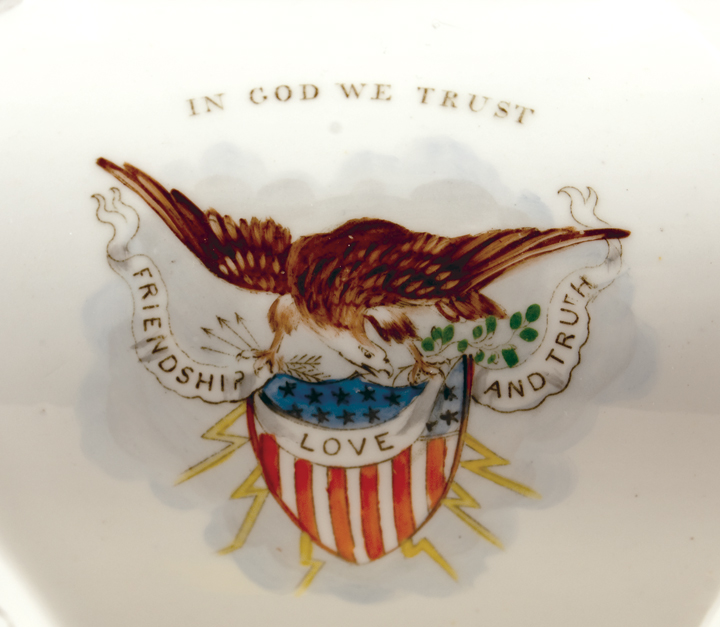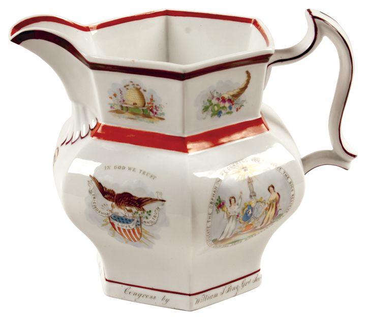 1845-Dated, Ornately Decorated and Colorful Ironstone Pitcher, with Multiple Patriotic American and Fraternal vignettes, “Clark Severing & Co. Importers, Baltimore,” Very Choice Near Mint.