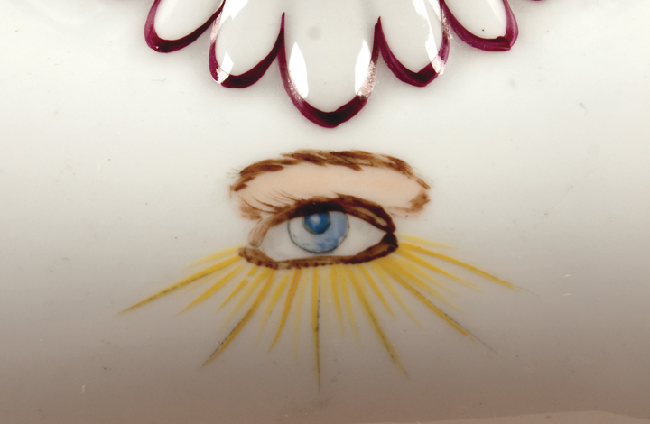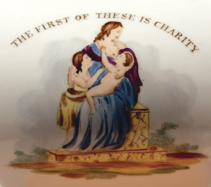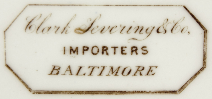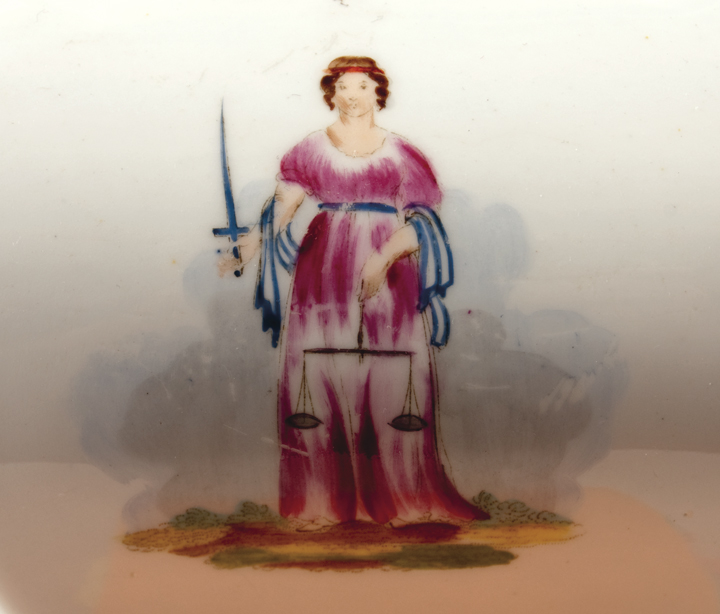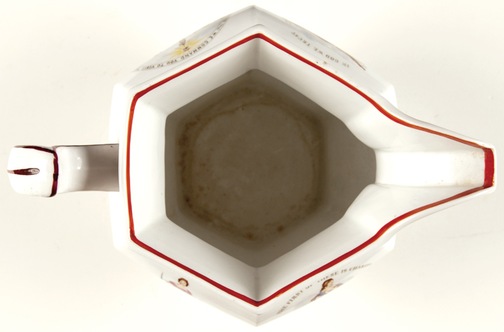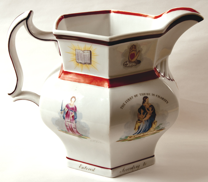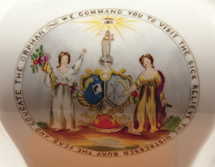 This gorgeous and highly colorful 7.25" high x 9.5” wide (front of spout to tail of handle) Ironstone pitcher is extensively decorated with nine different major symbols, plus two others devices that are smaller, plus a legend. Along the base it reads, “Entered - According to - Act of - Congress by - William S Ping Grd Secty - 1845.” Thus it would seem that this beautiful Pitcher was specially designed and produced in very limited quantity for that Masonic organization. This design recorded by Congress in 1845 per their Grand Secretary. “Clark Severing & Co. Importers, Baltimore,” on the bottom. Various color vignettes include: All Seeing Eye, American Heraldic Eagle and Legend, Beehive, Cornucopia, Masonic Legends and symbols, Holy Bible, “Justice,” Heart in Hand and a vignette on Charity. Outlined in rich deep burgundy and clay-tan colorations. Essentially “as made” with just a couple trivial signs of handling, and was likely only used for display.