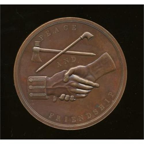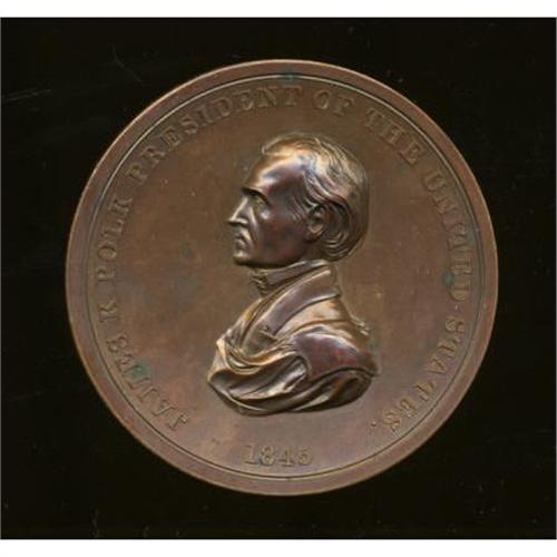 <B>1845 James K. Polk Indian Peace Medal, First Size, First Reverse MS64 NGC.</B></I> Julian IP-24. Bronzed copper, 75.5 mm, 193.3 gm, rim 6 mm. Like many of the Indian Peace medals in the present sale, this piece features the First Reverse (as distinguished from the Second Reverse). On the First Reverse, the right-hand index finger points above the F in FRIENDSHIP rather than the R, and the A's in PEACE AND are pointed. On the Second Reverse, the A's are flat-topped. The surfaces are fairly prooflike on this walnut-brown and cherry-red piece, which still shows considerable muted mint red and a couple of stray verdigris spots. The reverse is choice for the grade. The Ford sale was lacking a First Size, First Reverse of this issue in copper.<BR><BR><b>Shipping:</b> Coins & Currency (<a target="_blank" href="http://www.heritageauctions.com/common/shipping.php">view shipping information</a>)