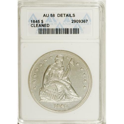 <B>1845 S$1 --Cleaned--ANACS. AU58 Details.</B></I> As profitable as it was to export and melt American dollars at the time, it is little wonder that so few survive today. This early Seated dollar, one of 24,500 pieces struck, has just a trace of friction on the highpoints, though the silver-gray surfaces are glossy and have hairlines in the fields. An interesting piece, appealing despite its flaws.<BR><BR><b>Shipping:</b> Coins & Currency (<a target="_blank" href="http://www.heritageauctions.com/common/shipping.php">view shipping information</a>)