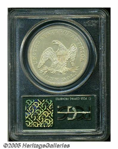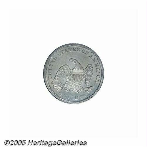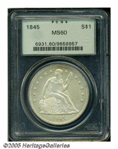<B>1845<S$1> MS60 PCGS.</B></I> The 1845 Seated dollar is a conditional scarcity in Choice AU and BU grades, even though 24,500 business strikes were minted. Apparently most entered circulation and few were set aside in high grade. A meager 24 Mint State examples have been certified by PCGS and NGC combined as of June 2005. The present coin displays bright surfaces that have a thin veneer of barely discernible golden color, and sharply executed design features. A few minor contact marks are scattered over the obverse, and some wispy slidemarks are noted in the fields of each side. Population: 2 in 60, 8 finer (6/05).<BR><I>From The Dr. John L. Pellegrini Collection of Liberty Seated Dollars.</B></I>