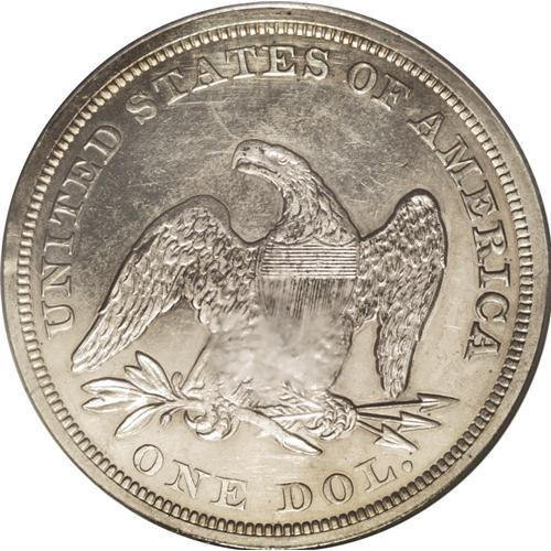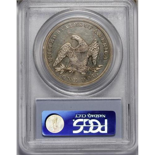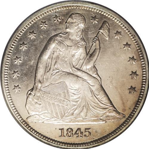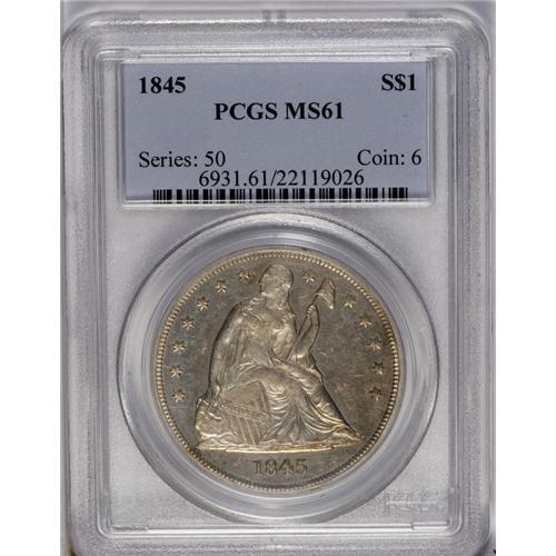<B>1845<img border='0' src='http://www.heritagecoins.com/images/star.gif' width=10 height=10>$1> MS61 PCGS.</B></I> A scarce and overlooked Seated dollar with a mintage of only 24,500 pieces. While circulated examples are usually available for a price, in Mint State the 1845 is exceedingly rare. It is the rarest Philadelphia-minted dollar of the 1840s, and may well be the rarest P-mint in the series, including the 1851 and '52.<BR> Light golden-gray toning covers each side, with some streaky indications of russet-peach color on the lower obverse. The obverse is well struck except for the right side stars and portions of Liberty's hair; on the reverse there is slight weakness on the eagle's plumage and left (facing) leg. The fields seem to have the usual semi-prooflike finish. There are no mentionable abrasions on either side, just a few wispy hairlines and nicks, in the fields, that restrict the grade. An exceptional opportunity for the advanced collector of this popular series. Population: 3 in 61, 7 finer (7/06).